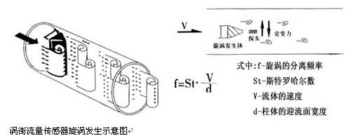 一定雷諾數(shù)范圍內(nèi)(2×104~7×106 ),旋渦的釋放頻率f與流體流速V及旋渦發(fā)生體的迎流面寬度d之間關(guān)系式為f=St?v/d,式中St 為斯特勞哈數(shù),它是一個(gè)無(wú)量綱的系數(shù),只要準(zhǔn)確測(cè)出頻率f,就可以求得流體流速v,由v求出體積流量。