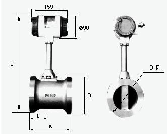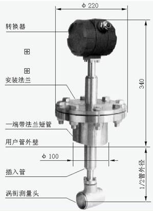將渦街測(cè)量頭插入管道特定位置,通過測(cè)量該位置的局部流量,根據(jù)管道截面流速分布關(guān)系,計(jì)算出管道內(nèi)平均流速值。它由轉(zhuǎn)換器、插入桿組件、球閥(根據(jù)需求配 )、安裝短管(ф100)、渦街測(cè)量頭等組成。