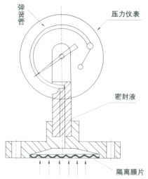 為了擴大各種通用型壓力儀表的使用范圍,能適用于測量強腐蝕、高溫、高粘度、易結晶、易凝固和有固體浮游物介質的壓力,以及對某些測量介質不能直接進入通用型儀表內和便于清洗防止沉淀物持積聚的場合的壓力檢測時,須采用由隔膜隔離器與通用型壓力儀表組成一個系統的隔膜表。