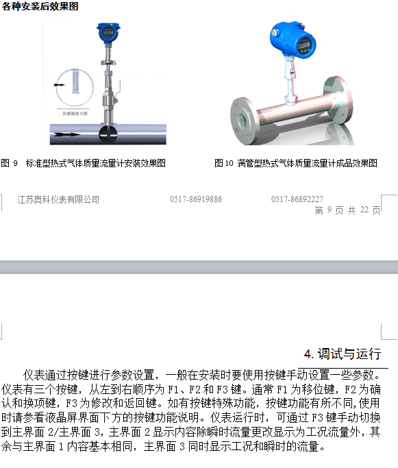 4) 根據現場測得的數據換算出在傳感器連接桿上的相應刻度,鎖緊螺母即可。5) 如果您是橫向安裝的本款儀表的顯示屏可以90°180°270°的靈活安裝,滿足你現場實際需要。 參照附錄3圖(滿管型熱式氣體質量流量計在預安裝前請再次確認。管段的連接方式,準備法蘭連接相關的物品如墊片和螺栓等。安裝前須停產,并嚴格遵守工廠的相關規定。滿管型儀表在出廠是已經把傳感器正確的裝配在專用的管段上,用戶只需要把管道裝配到現場,因此相對現場插入式的安裝要簡單些。首先在管路上選擇合適的安裝點然后按照必要配套的管段的長度切割管道、安裝相應法蘭和螺栓。確定流體流量要與滿管型熱式氣體質量流量計所標的流量標識一致。并且顯示屏要垂直與水平面,管道軸心要平行水平面,誤差不能超過±2.5°zui后用螺栓鎖緊儀表。
