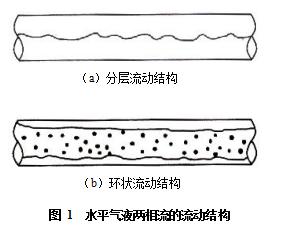 當(dāng)流速特別高的時候,也會表現(xiàn)為環(huán)狀流動,即管壁上有液膜,管道中心部分為帶液滴的氣核,由于水平流動時重力的影響作用,下部液膜要比上部管壁的厚,如圖1(b)所示。